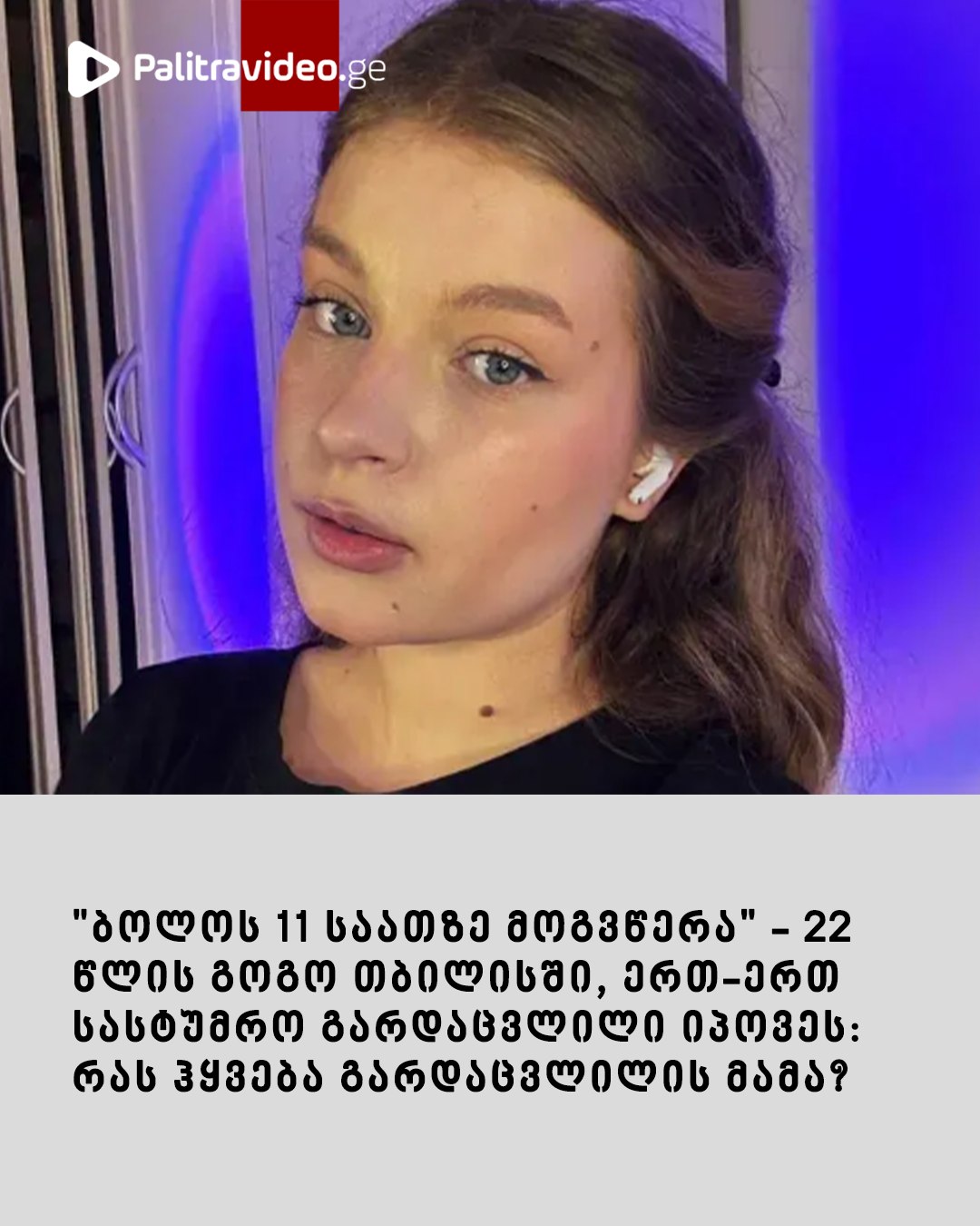 რუსული მედიის ცნობით, თბილისში, სასტუმრო Panorama 360 Hotel-ში, 22 წლის რუსეთის მოქალაქე ალინა კამბაროვა გარდაცვლილი იპოვეს. შემთხვევა, რომელიც უამრავ კითხვის ნიშანს აჩენს, რამდენიმე დღის წინ მოხდა. გოგონას მამა მედიასთან შვილის ბოლო საათებსა და მათ ბოლო კომუნიკაციაზე საუბრობს.